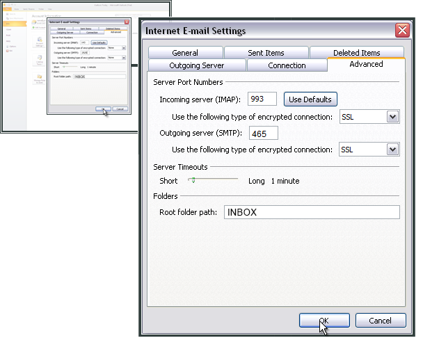 Para el Outgoing server (SMTP) (servidor saliente), escriba 465 y seleccione SSL.