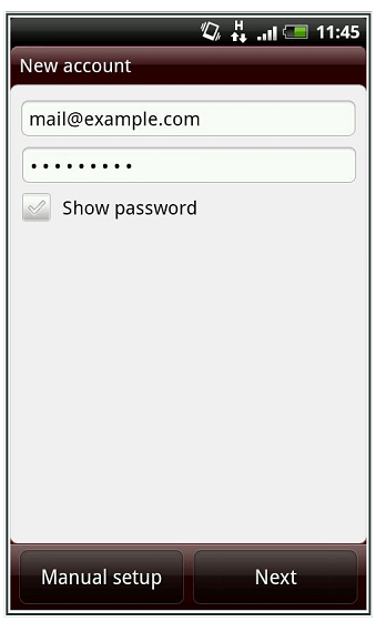 Abra la aplicación de correo electrónico en su teléfono y seleccione crear una nueva cuenta. Ingrese su dirección de correo electrónico y la contraseña que ha seleccionado para la cuenta de correo electrónico en el Panel de Control. A continuación, haga clic en Manual setup.