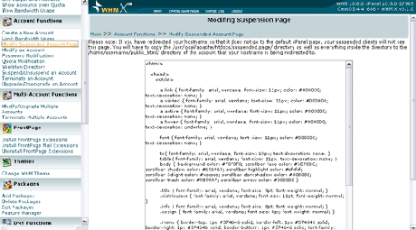 Clickeas en Modify Suspended Account Page de tu menú WHM y editas el contenido del campo de texto.